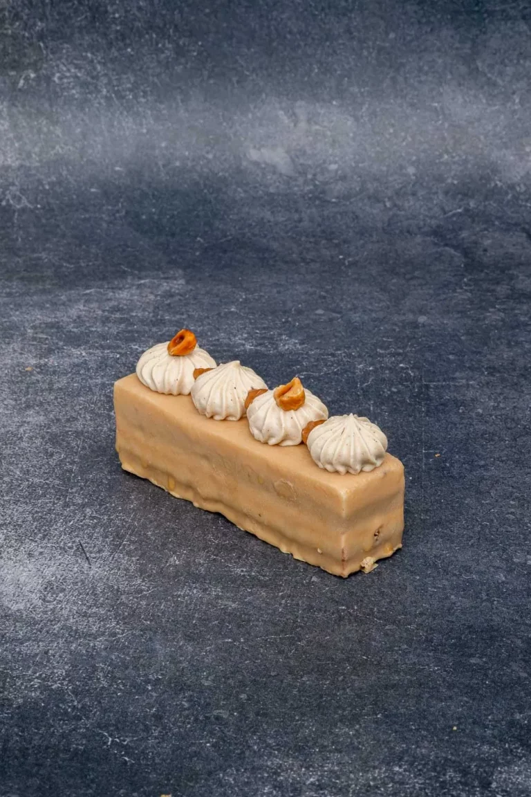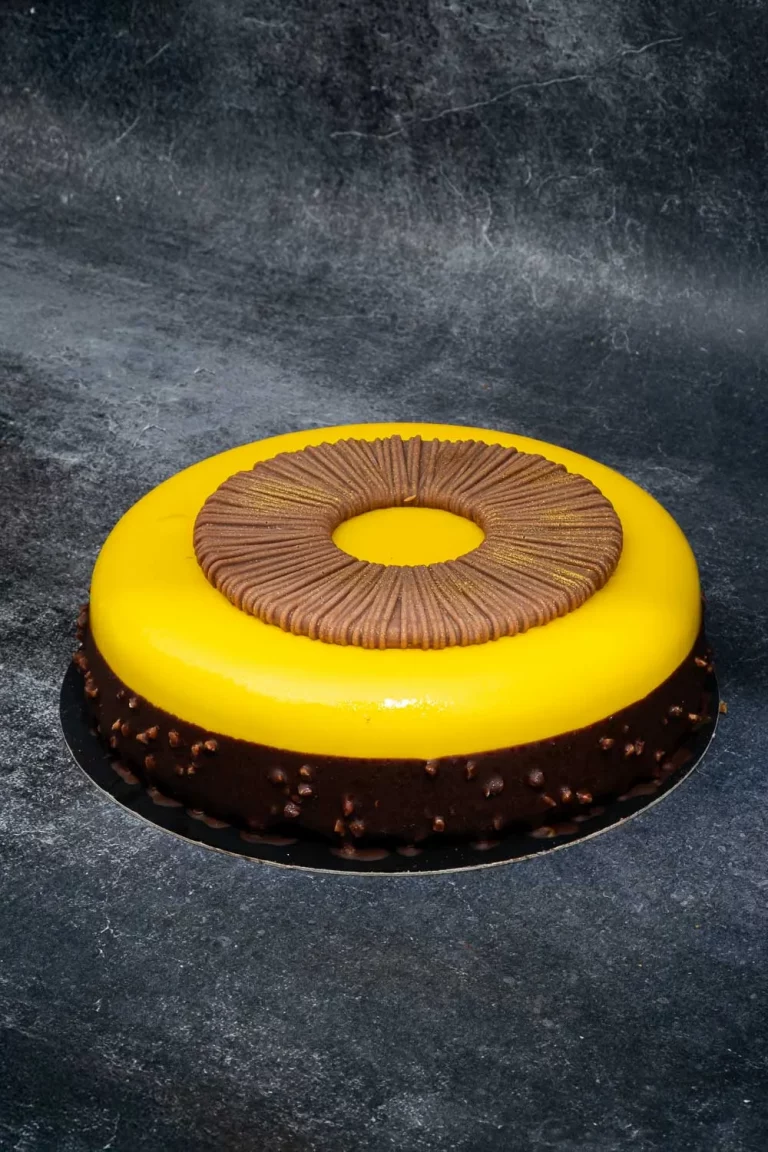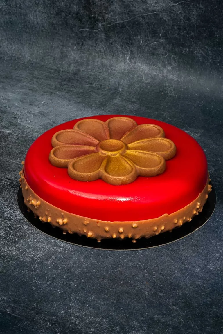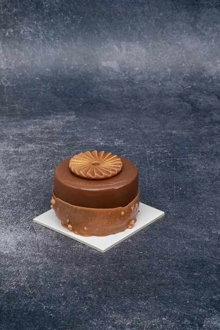 Entremet au caramel avec glaçage miroir réalisé par Maison Millet.