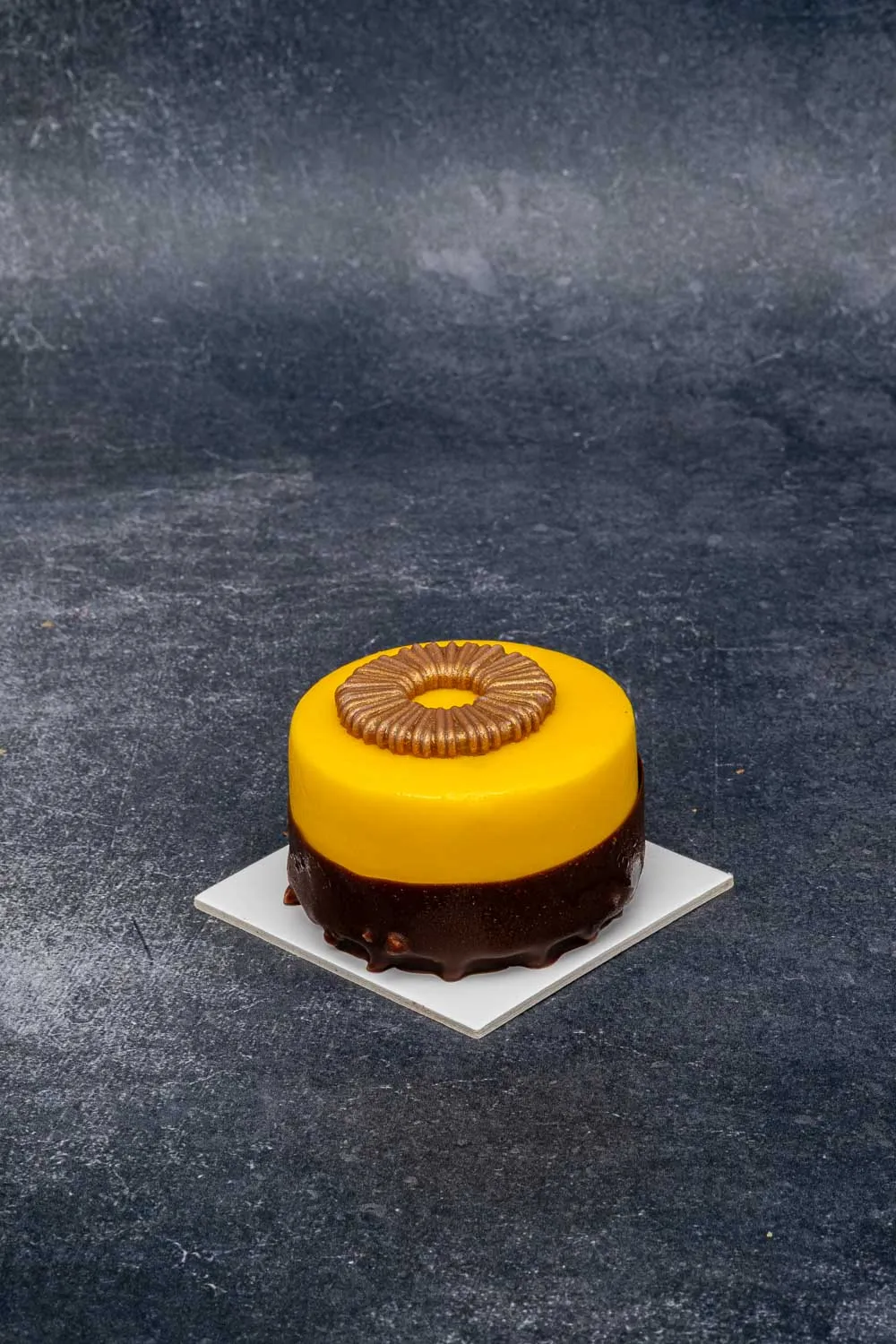 Le Dôme Exotique de la boulangerie-pâtisserie Millet, un mariage parfait de saveurs tropicales avec une mousse mangue-passion coco et un biscuit nature. Un voyage gustatif à chaque bouchée.