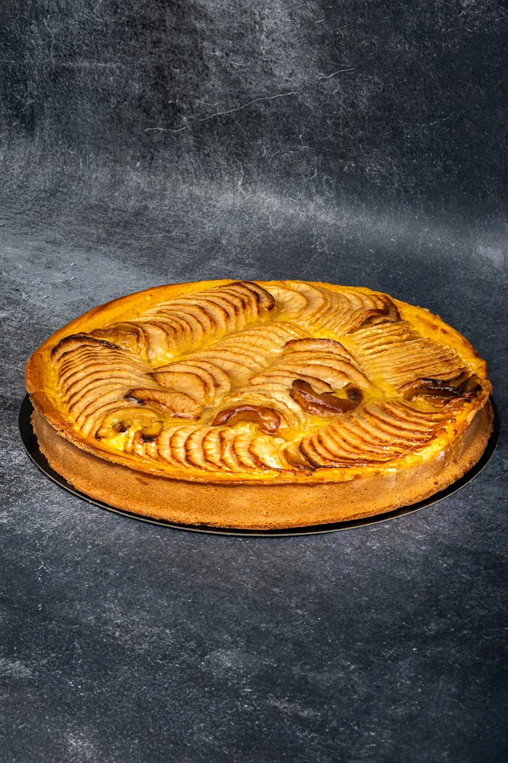 Pâte sablée croustillante, crème pâtissière onctueuse et pommes fondantes caramélisées. Un dessert classique et réconfortant, avec un petit effet flan.